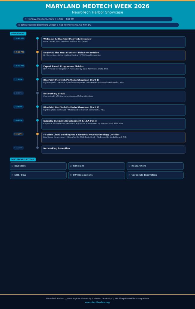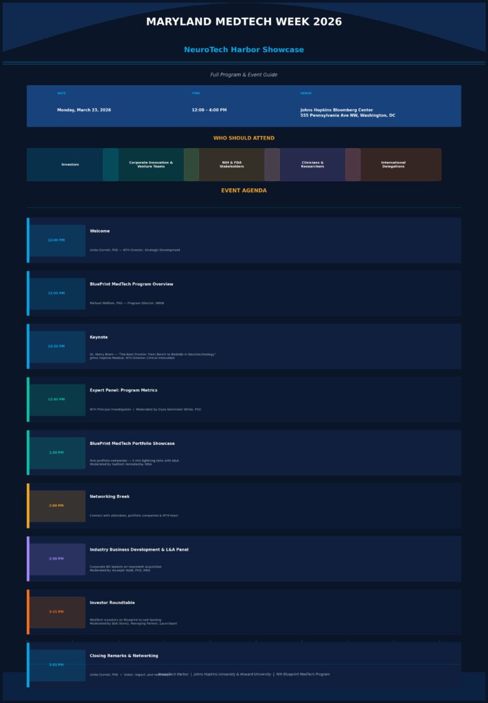NeuroTech Harbor (NTH) is a partnership between Johns Hopkins University and Howard University, and projects to spend between $30-$50M to launch 45 new neurological health innovation projects over the next 5 years.